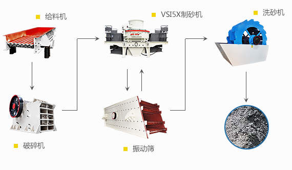 机制砂生产由原料预处理系统、计量中控系统、粉合系统、包装系统、收尘系统五大系统组成,采用干法生产工艺,包括给料、碎石与机制砂整形、级配调整、筛分、砂粉分离、粉尘收集、输送、电气控制等工作模块,主要设备包括GZD振动给料机、PE颚式破碎机、5X制砂机、XSD洗砂机、MC除尘器、YZS振动筛、KX选粉机、B皮带输送机、砂石粉分离机、电控系统等,可以对入料尺寸为50mm以下各种岩石颗粒进行加工整形,获得符合一定比例要求和相关质量要求的精品碎石和精品机制砂。